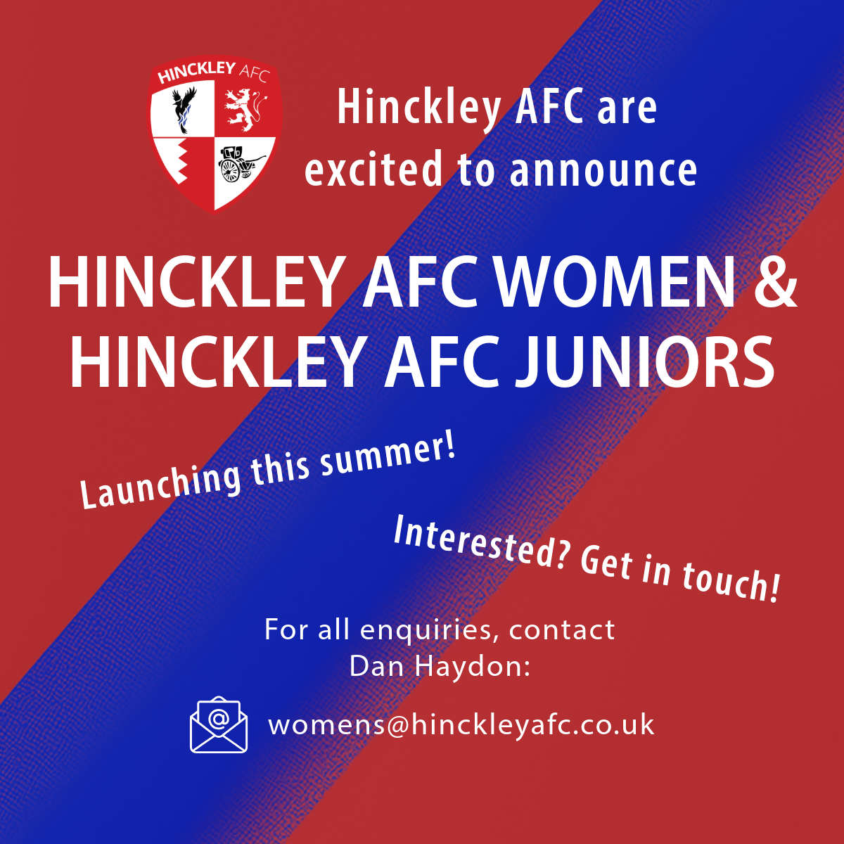 For all enquiries regarding joining the club’s women’s side or junior teams, please contact Dan Haydon by emailing womens@hinckleyafc.co.uk.